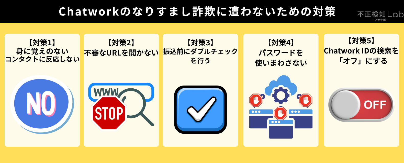 本章では、個人が行うべきChatworkのなりすまし詐欺に遭わないための事前対策について、以下の5つの対策を解説していきます。