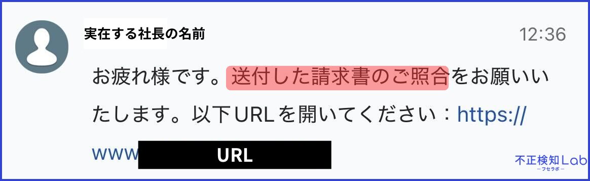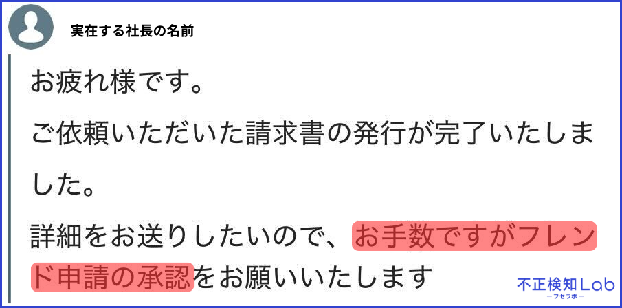 ある日突然、社長や役員を装ったアカウントから「請求書を確認してください」と、不審なURLを含んだメッセージやコンタクト申請が送られてくるケースがあります。