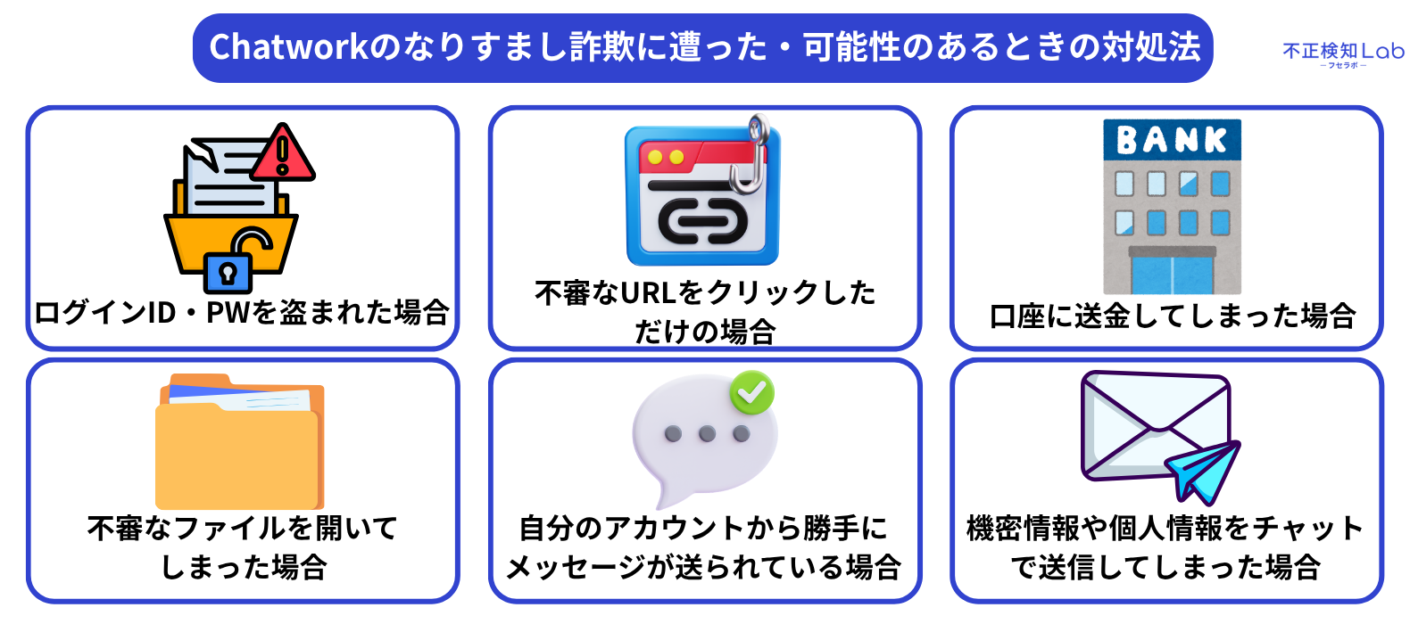 手口を理解することで、実際にChatworkのなりすまし詐欺を受信した時に、「このチャットは怪しい」と疑いをかけて詐欺に遭うリスクを減らすことができます。