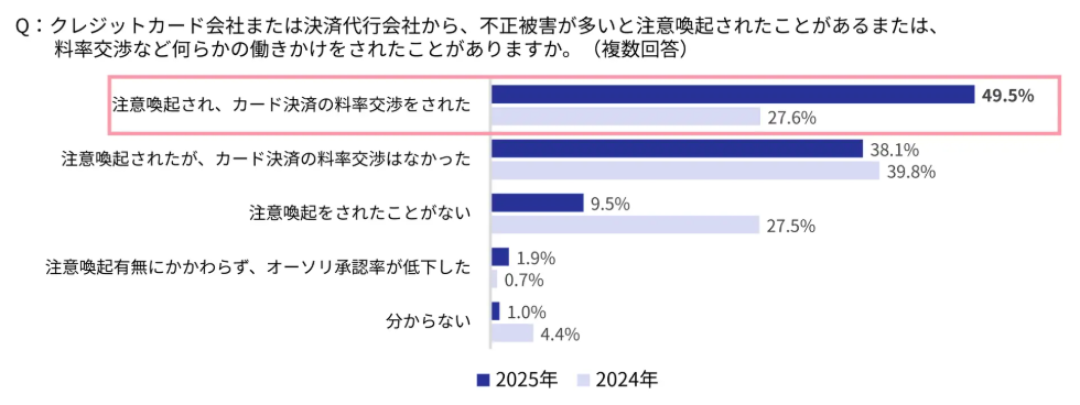 先ほどお話しした、クレジットカード決済手数料の値上げ交渉は、2025年に3Dセキュアが導入義務化された後も増加し続けています。