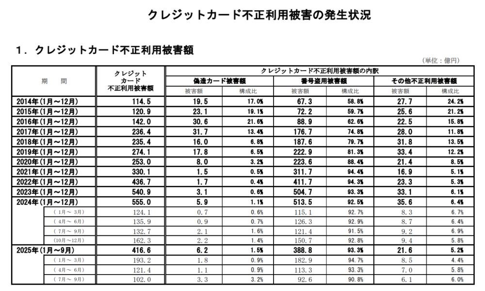以下の表は、クレジットカードの不正利用被害の発生状況をまとめたものです。