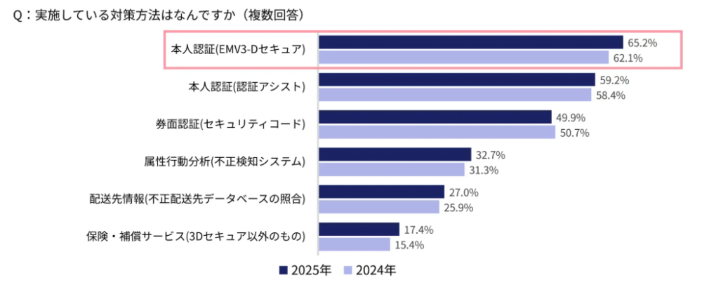 Caccoが実施した「EC事業者実態調査2025」では、クレジットカードの不正利用などの不正注文対策として3Dセキュアを導入しているEC事業者は65.2%で、前年よりも3%増となっています。