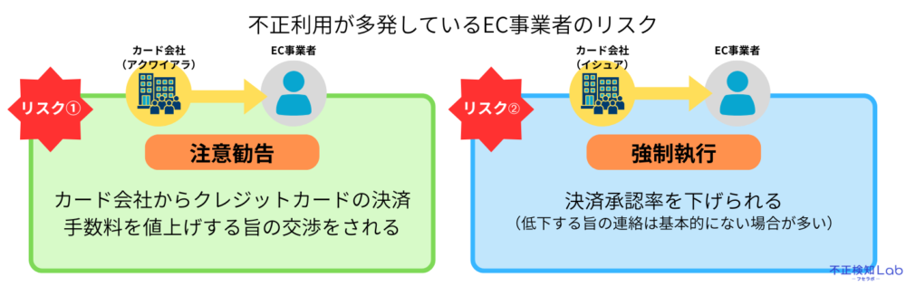 つまり、カード会社はリスクが高いEC事業者に対して、「このままだとクレジットカードの決済手数料を値上げしますよ!」と注意喚起を行い、少しでもリスクや負担を抑える行動をとっているということです。