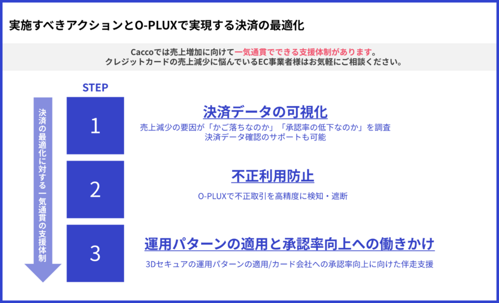 当サイトを運営するCaccoでは、3Dセキュアをも突破する不正手口も防ぐことができる不正検知サービス「O-PLUX」を開発・提供しており、「O-PLUX」については本記事の後半『「決済手数料値上げ」や「決済承認率低下」対策なら「O-PLUX」が効果的』でご紹介しています。