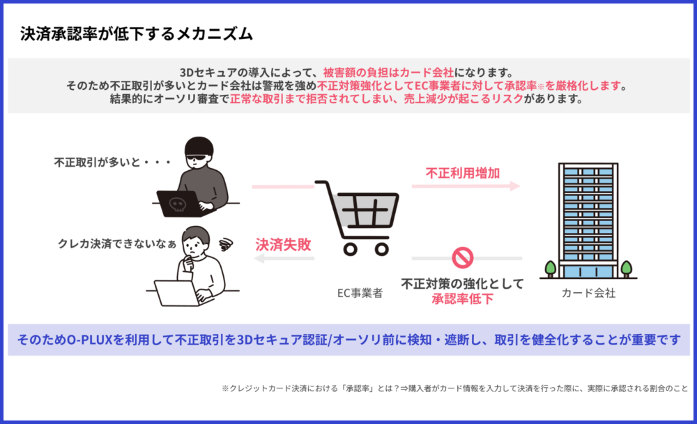 3Dセキュアの導入義務化以降、不正利用対策の重要性が一層高まり、クレジットカード決済手数料の値上げ交渉だけではなく、決済承認率の低下もEC事業者の売上に深刻な影響を与えています。
