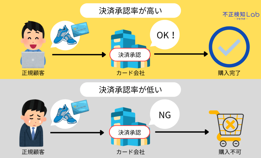 逆に決済承認率が低いと、正規の顧客でも決済が不承認となる確率が高まり、商品を購入されず売上減少につながります。