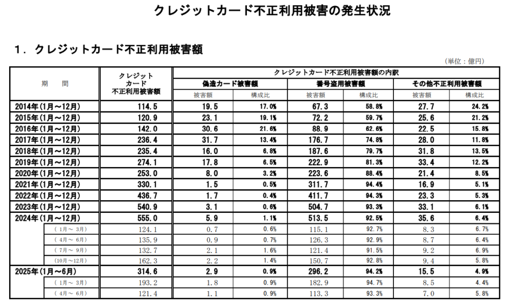 実際にクレジットカードの不正利用被害額は増加傾向にあり、2024年は過去最多の555億円となりました。